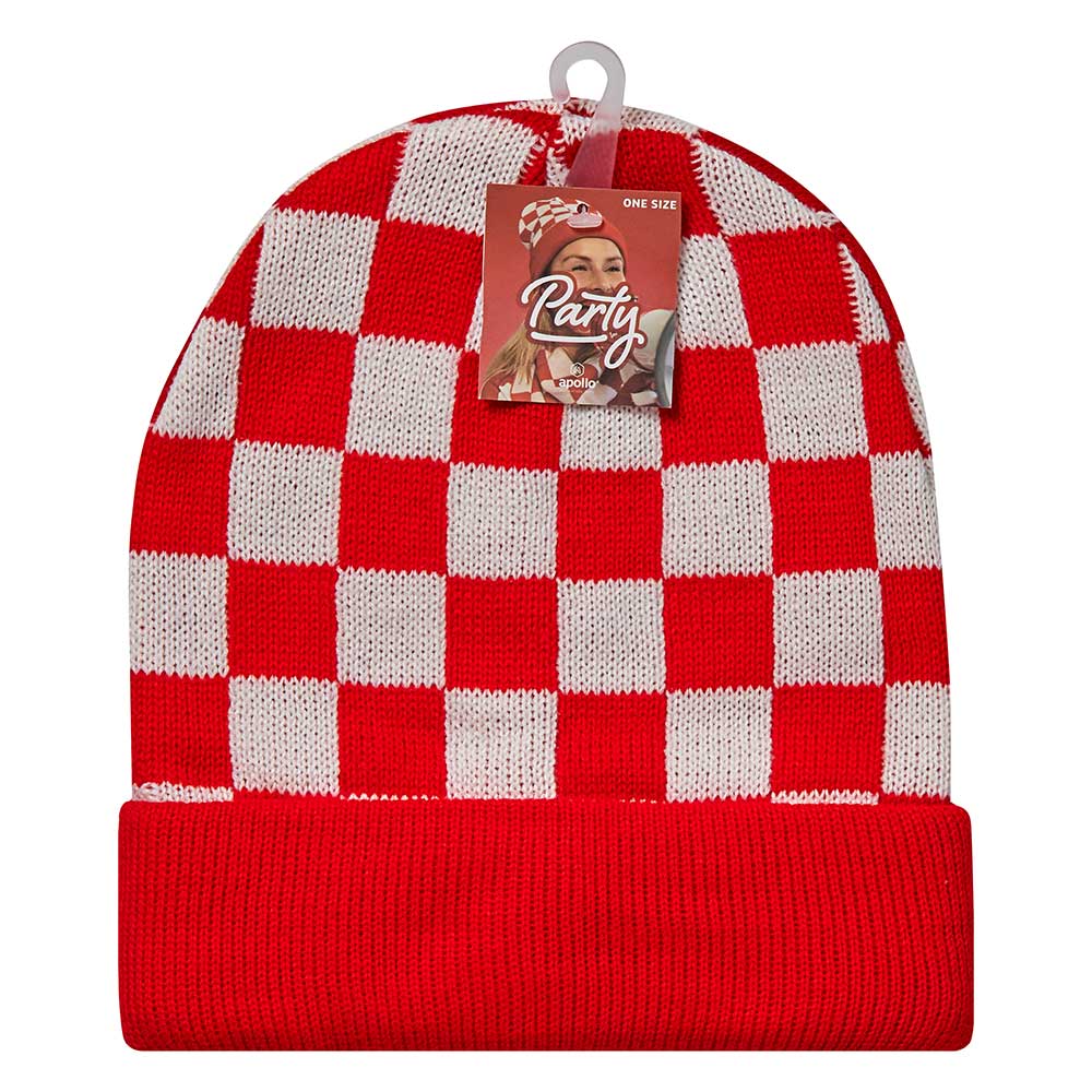 Met deze kleurig geblokte muts geef je jouw outfit een Brabants tintje. Het breisel met omslag houd je lekker warm zodat je lekker lang kunt doorfeesten. Apollo party. Get the party started.