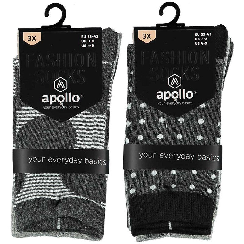 Kleurrijke dames fashion sokken met print in de kleur assorti grijs. Deze kleurrijke katoenen damessokken zijn verkrijgbaar in de maat 35/42 in onze webshop. De sokken hebben een heerlijk draagcomfort en zijn voorzien van een vrolijk print in de kleur assorti grijs. De naadloze sokken van Apollo worden gekenmerkt door hun stevigheid, kleur- en slijtvastheid en zijn perfect te dragen voor iedere gelegenheid. De sokken worden geleverd als 6-Pak en zijn daarom extra scherp geprijsd in onze webshop.