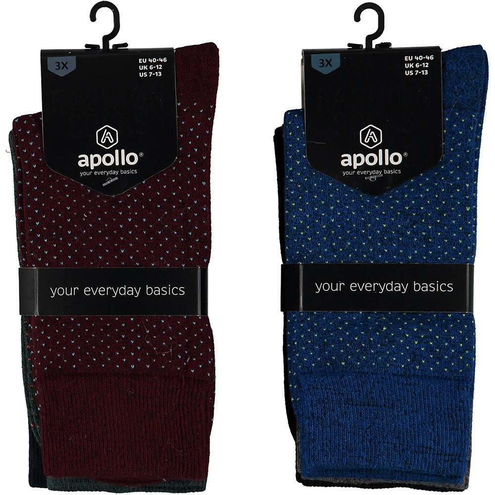 Kleurrijke basic fashion sokken van Apollo met stipmotief. De katoenen sokken zijn uitermate geschikt als business sok en worden als 2 x 3 paar bij u thuis geleverd. Deze kleurrijke katoenen sokken hebben een heerlijk passend draagcomfort en zijn voorzien van een vrolijk dessin voor iedere gelegenheid. Deze naadloze sokken zijn van bijzonder stevige kwaliteit, kleur- en slijtvast en perfect te dragen gedurende het hele jaar. De fijne afwerking en de vocht opnemende werking wordt door veel mensen gewaardeerd. Bestel eenvoudig je kleurrijke katoenen sokken in onze webshop.