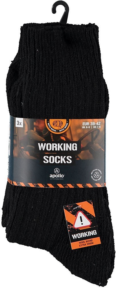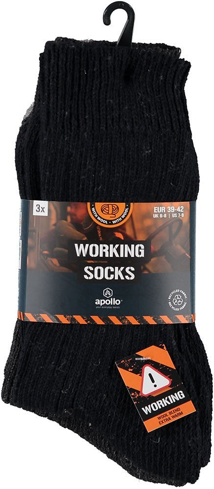 Aantrekkelijk 6-Pack Noorse wollen werksokken met badstof voetbed van Apollo. Geniet van het heerlijke warme comfort van deze werksokken van gerecycled wol met badstof voetbed. Heerlijk warm, comfortabel en zacht. Door de degelijke kwaliteit en de extra versterkte hakken en teenstukken slijten de sokken minder snel. Hierdoor zijn ze zeer geschikt om te dragen tijdens het werken, in klompen en veiligheidsschoenen. De ribstructuur en goede pasvorm zorgt ervoor dat deze sokken goed om je been blijven zitten.